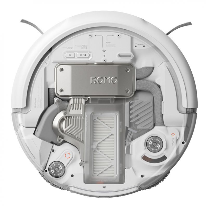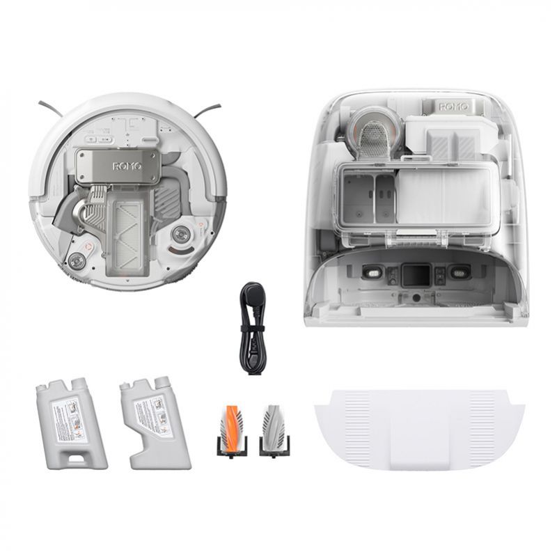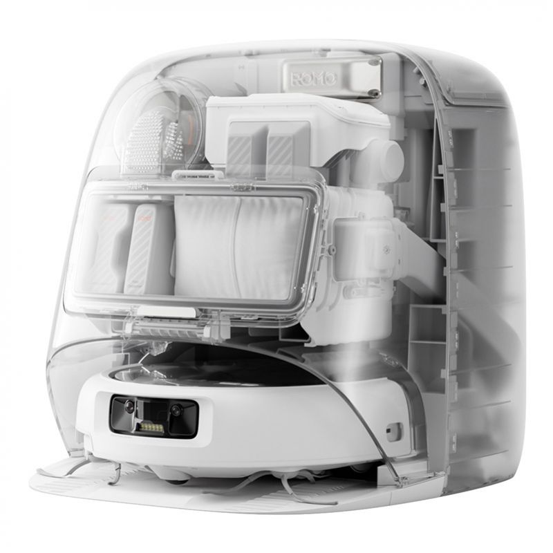 DJI ROMO P i jego stacja wyróżniają się eleganckim designem – przezroczyste elementy obudowy pozwalają zajrzeć do środka i zobaczyć technologię w akcji. Urządzenie jest nie tylko funkcjonalne, ale również estetyczne – świetnie wpisze się w każdy nowoczesny dom.