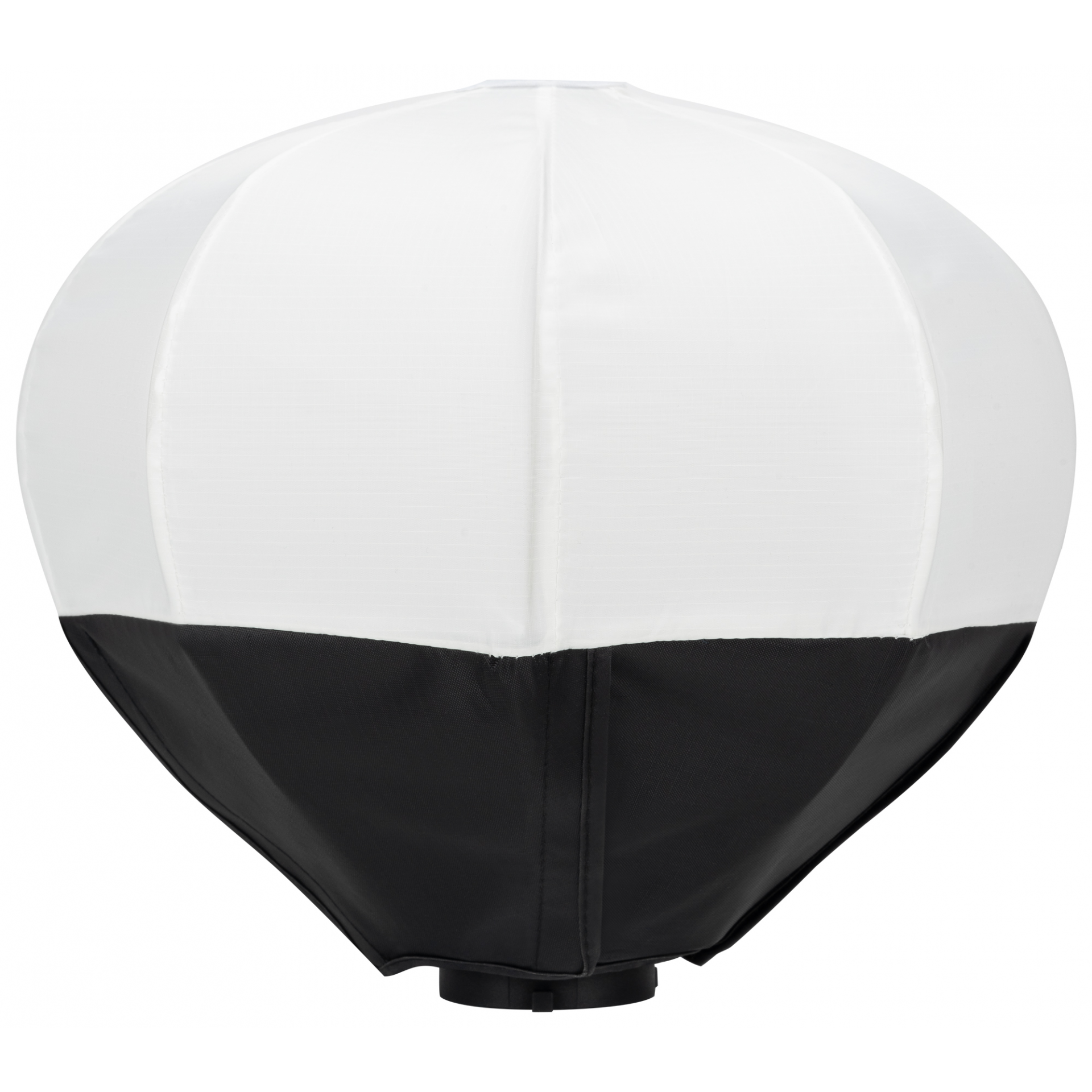 Softbox lantern Newell 30 cm Mini Bowens to sferyczna konstrukcja bazująca na 8 sekcjach materiału, rozpiętych na 7 solidnych drutach stelaża. Charakterystyczny kształt bombki zapewnia bardziej okrągłe, naturalne rozproszenie światła niż kwadratowe czy prostokątne softboxy. Biały materiał dyfuzyjny maksymalizuje miękkość, eliminując twarde przejścia między światłem a cieniem. Czarna osłona umieszczona przy mocowaniu Mini Bowens zapobiega wyciekom światła w kierunku lampy, kierując całą moc w stronę fotografowanego obiektu. To przemyślana konstrukcja, która łączy funkcjonalność z wysoką jakością wykonania.