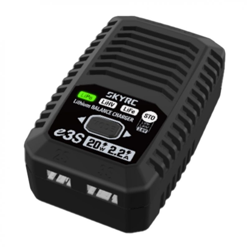 Ładowarka SkyRC e3S to kompaktowe i proste w obsłudze urządzenie przeznaczone do ładowania akumulatorów litowych stosowanych między innymi w modelach RC. Obsługuje popularne typy baterii LiPo, LiHV oraz LiFe w konfiguracji 2S i 3S. Dzięki automatycznemu procesowi ładowania oraz wbudowanemu balanserowi pozwala wygodnie i bezpiecznie przygotować akumulatory do pracy. Niewielkie wymiary oraz zasilanie z gniazdka sieciowego sprawiają, że ładowarka sprawdzi się zarówno w domu, jak i w warsztacie modelarskim.