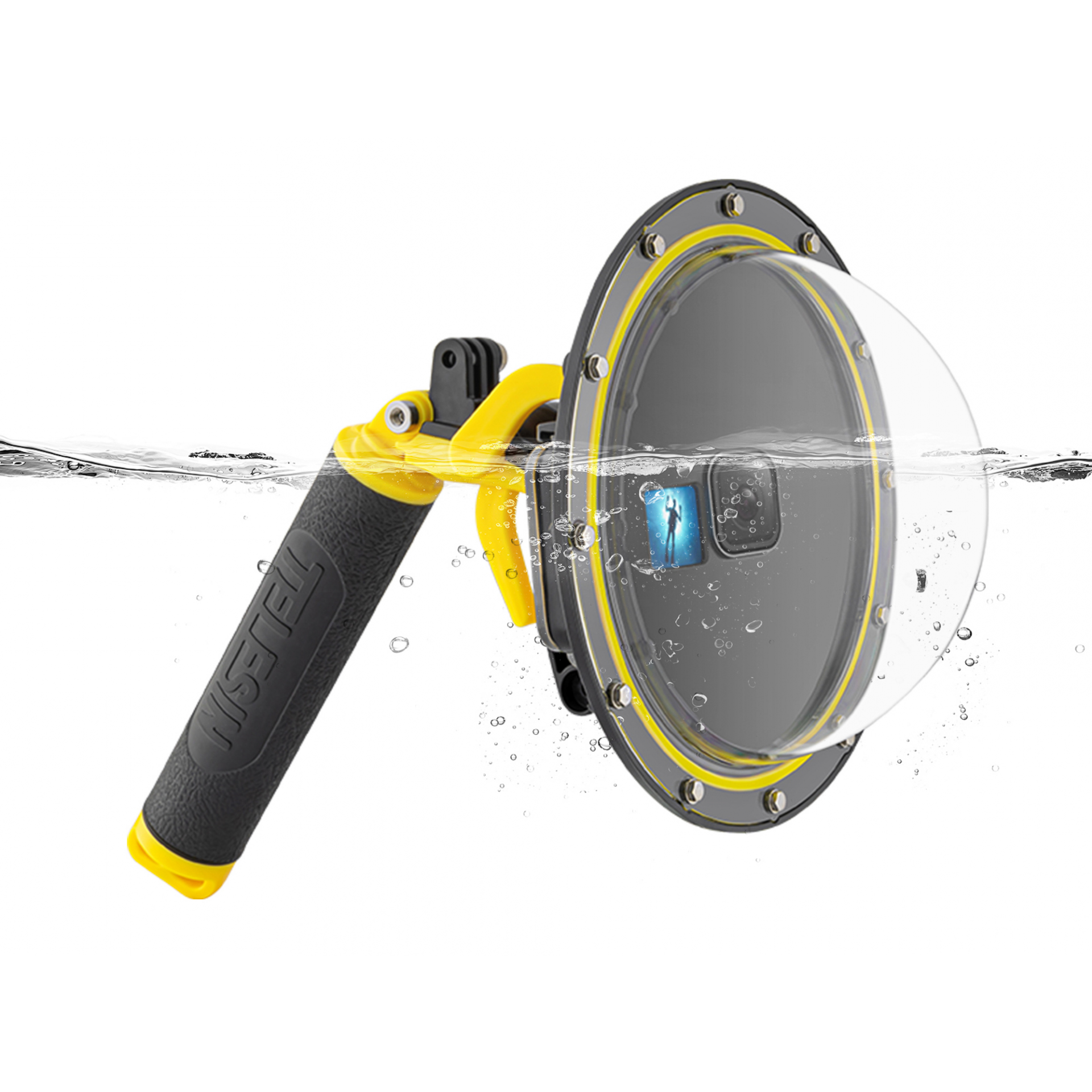 Telesin GP-DMP-T09 to coś więcej niż zwykła wodoodporna obudowa. To unikalna konstrukcja z przezroczystą kopułą, która całkowicie zmienia sposób filmowania pod wodą. Półkulisty kształt obudowy eliminuje zniekształcenia wywołane refrakcją światła, dzięki czemu obraz pod wodą jest tak samo ostry i naturalny jak na powierzchni. To właśnie ten typ obudowy pozwala realizować efektowne ujęcia „split-shot” z jedną połową kadru pod wodą i drugą nad jej powierzchnią.